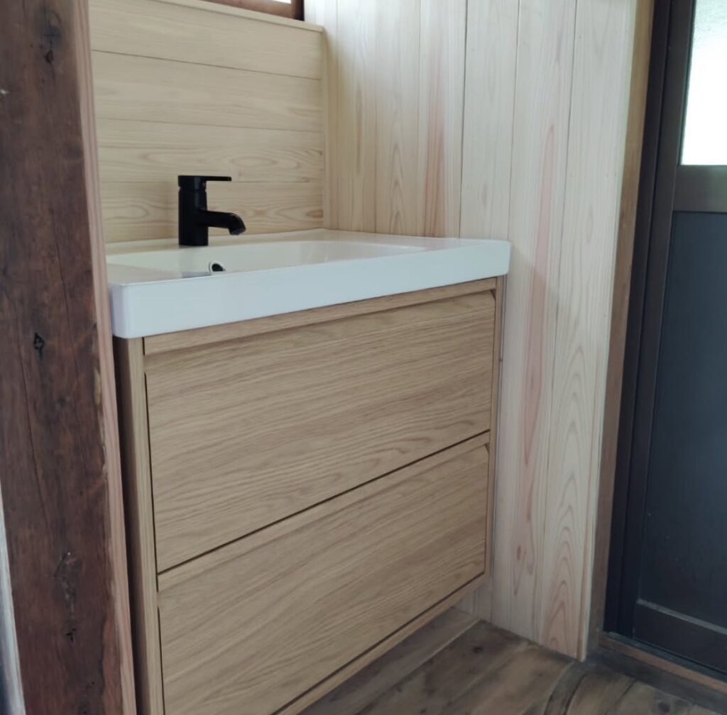既存撤去・床、壁板張り・洗面台取付け
